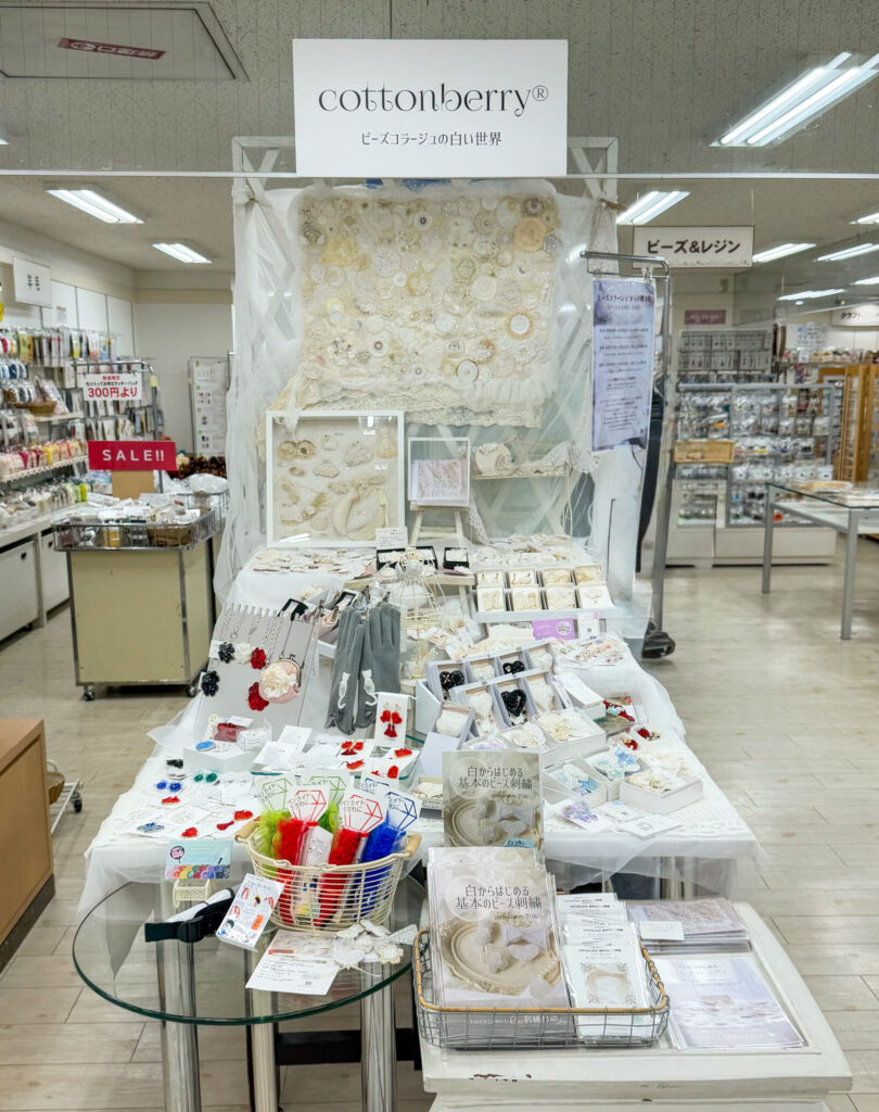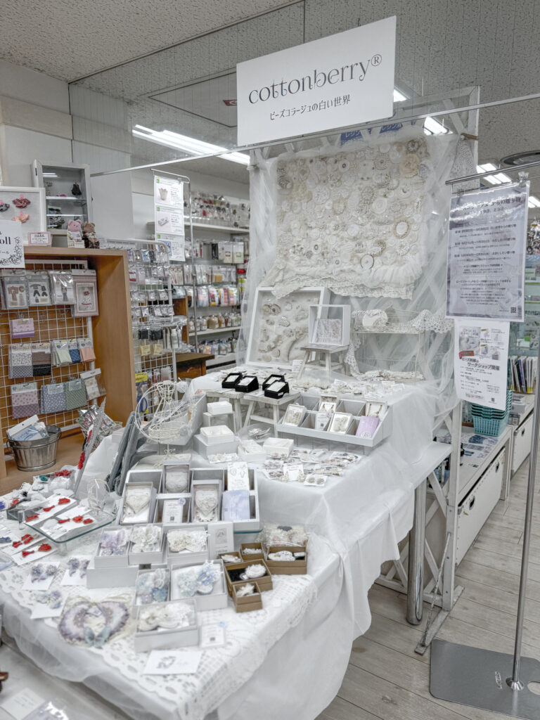今回は、ビーズコラージュの展示の近く、ビーズコーナーでのワークショップ開催だったため、お買い物にいらした方に興味深くご覧いただいたり、お声掛けいただいたりもしました。